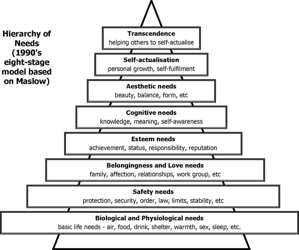 - 특히 존중 욕구와 자아실현 욕구 사이에 두 단계를, 그리고 자아실현의 꼭대기에 한 단계를 추가하여 인간 동기를 더 정교하게 설명했다.